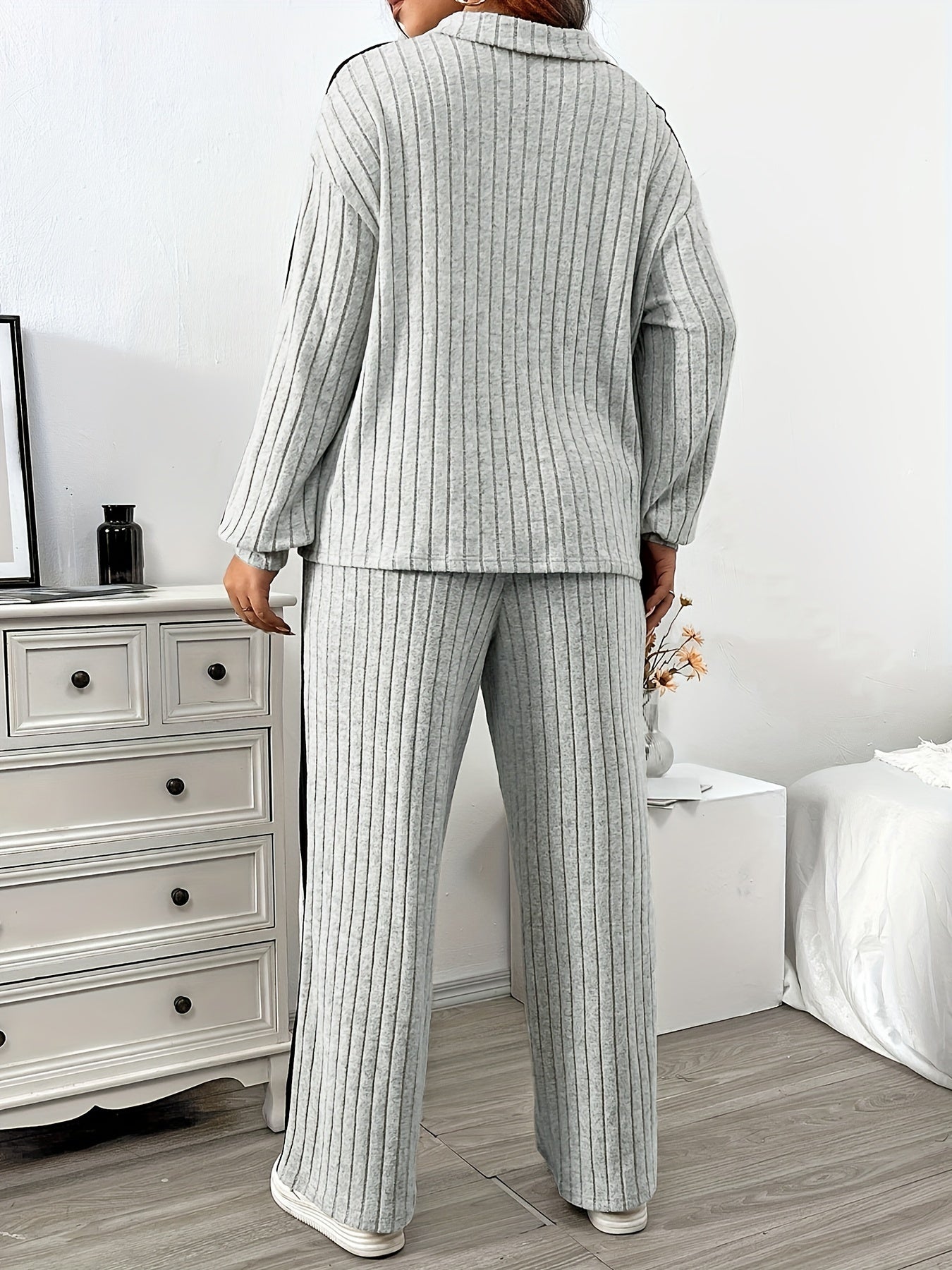 Composition: 100% PolyesterMaterial: PolyesterScene: CasualCare: Machine wash or professional dry cleanType: Lash SetsCollar Style: LapelPlacket Type: PulloversFabric: Medium StretchSheer: NoPattern: StripesStyle: CasualSleeve Type: Regular SleeveSleeve Length: Long SleevePrinting Type: No Printi...